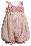 | Sleeveless pink and white dot print chiffon romper with foil dot accents and ruffle trim. ...Read