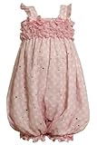 | Sleeveless pink and white dot print chiffon romper with foil dot accents and ruffle trim. ...Read