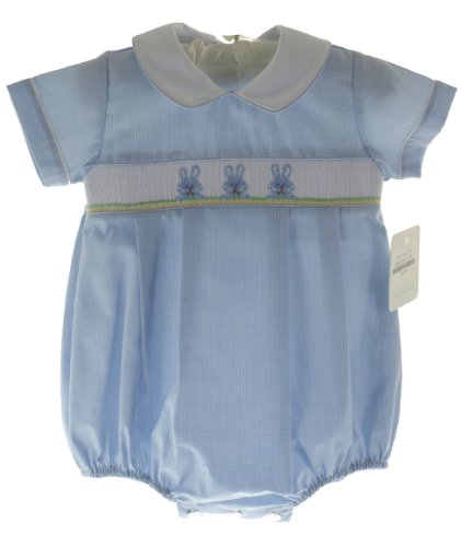 | Baby boys blue gingham smocked bubble outfit for Easter has three bunny rabbit faces smocked across the chest. Infant boys smocked Easter bubble has white collar and buttons between the legs and at the neck. 65% Polyester 35% Cotton. Hand Smocked ...Read