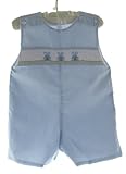 | Boys smocked Easter John John outfit in light blue gingham fabric has three bunny rabbit faces smocked across the chest. Cute smocked Easter outfit for baby boy. 65% Polyester 35% Cotton. Hand smocked. ...Read