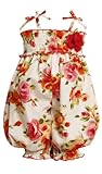 | Sleeveless orange and pink floral print romper/coverall with smocked bodice, flower applique accent and bow trim. |