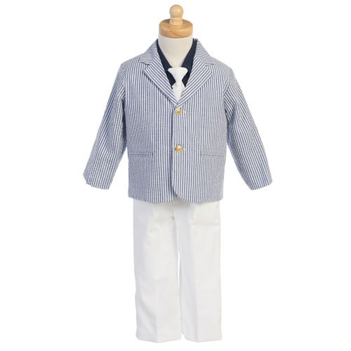 | A sweet spring suit from Lito! This 4 piece set includes a long sleeved blue shirt, jacket, white pants, and matching tie. It is constructed of a blue striped seersucker. A classic Easter look for a handsome boy!< ...Read
